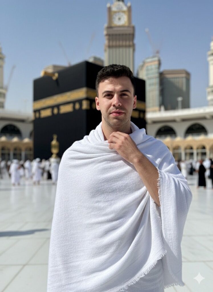 Clothing should be Hajj attire — white Ihram for men or modest black abaya for women.