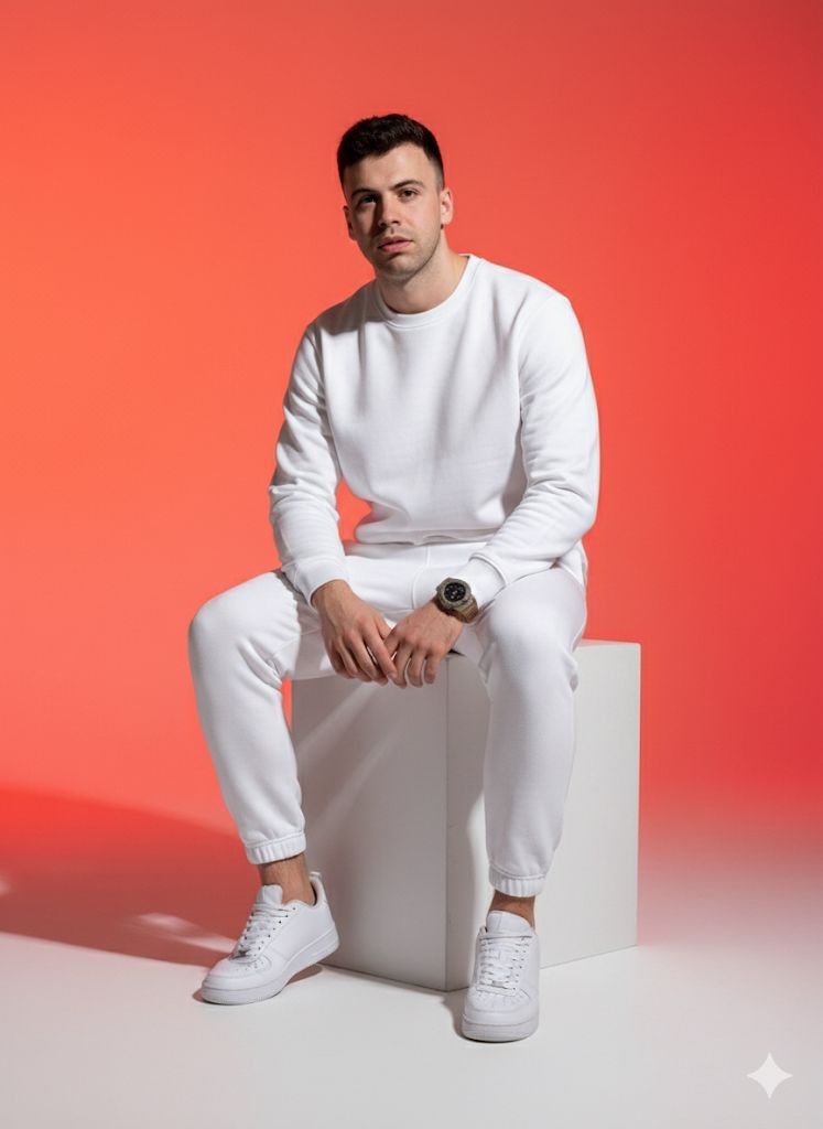 The image shows a young man sitting on a white cubic object, against a red gradient background. He is wearing a white sweatsuit, consisting of a crewneck sweatshirt and sweatpants, paired with white sneakers. His hair is short and dark. He is looking directly at the camera. The lighting is studio-style, creating soft shadows. Young Man in White Sweatsuit, A young man is seated on a white cube positioned at an angle to the camera, with his gaze directed forward, the backdrop consists of a vibrant gradient transitioning into red hues, he is dressed in a matching white sweatsuit and sneakers, showcasing a minimalist aesthetic, the instruction is to render the subject within a studio-style lighting arrangement with attention to capturing the texture of the clothing and the soft gradation of the backdrop, also maintain the direct eye contact for an engaging portrait.