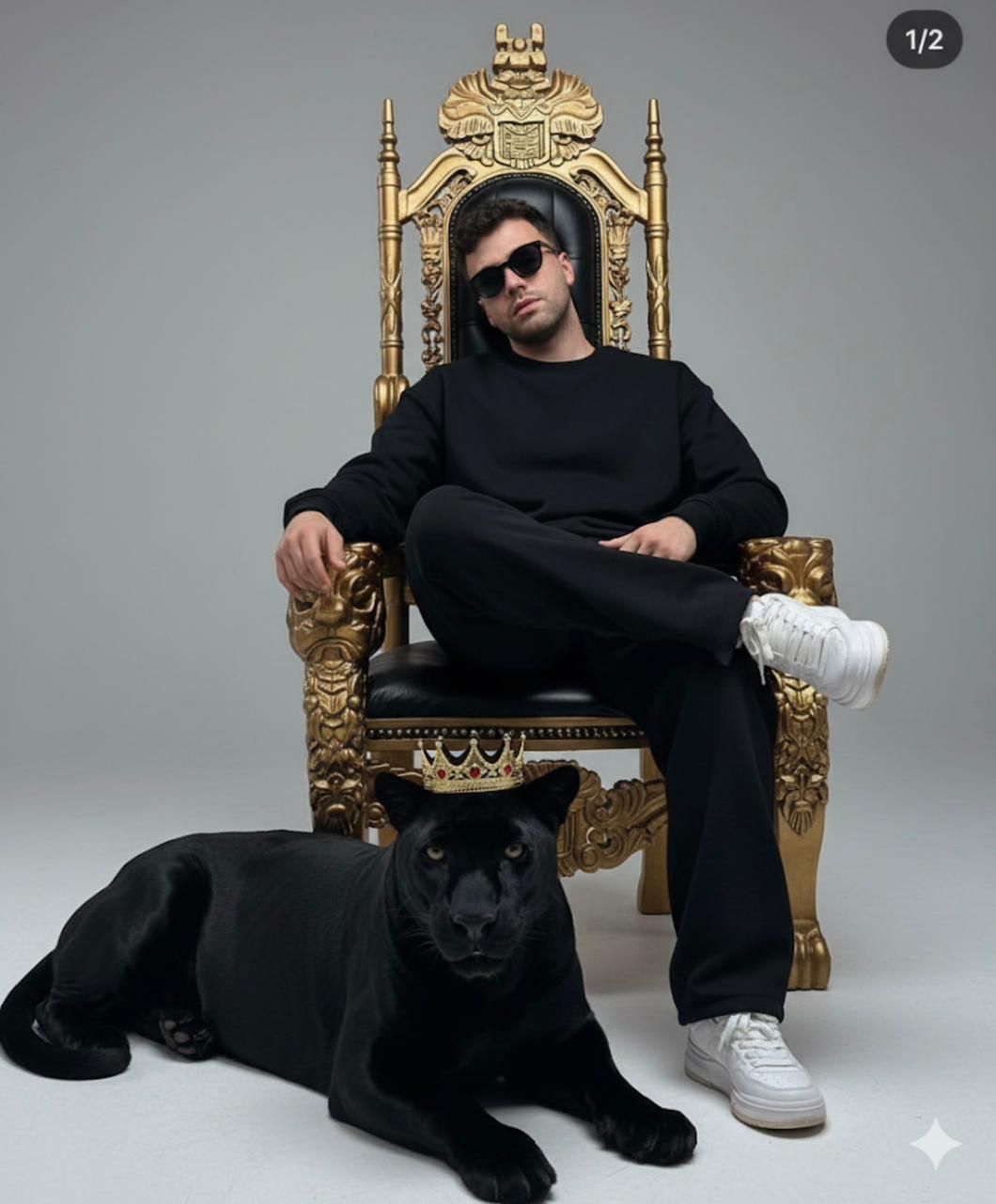 Change the image to a modern studio with gray background and black furniture. She sat on a black chair. The right hand is placed on the knees. The left hand hugged the black doberman breed. Her eyes should turn to the camera. Reflecting confidence and mystery He wears a large blazer, black pants and beautiful black leather shoes with sunglasses.