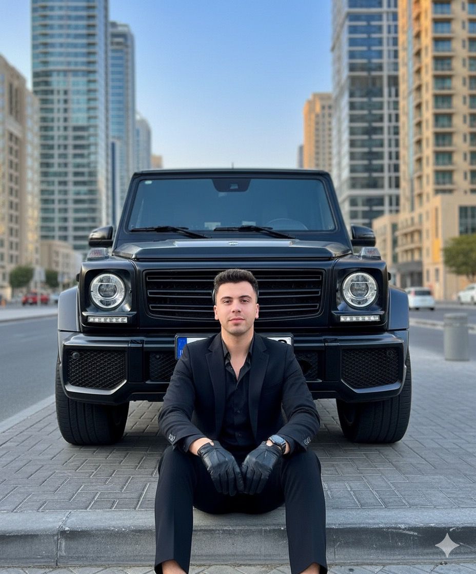 He is sitting in front of a luxury black Mercedes G-Wagon, wearing a full black outfit: slim black suit, black shirt (slightly open from top), and black trousers. He wears stylish black leather gloves.