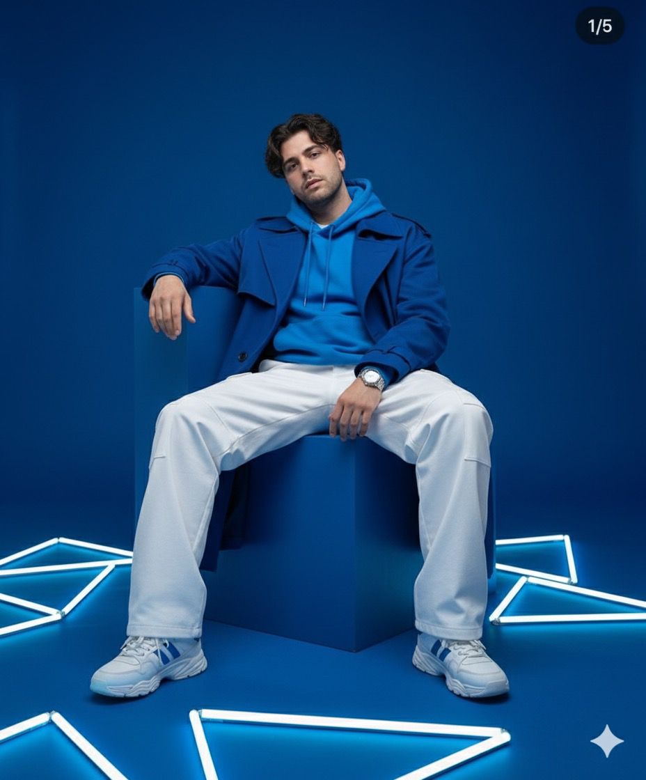 Hyper-realistic cinematic full-body fashion photoshoot of a 25-year-old male, 5’5″ in height, with the exact face and medium-length wavy hairstyle from the uploaded image, perfectly styled. Seated on a deep blue cube-shaped chair, leaning slightly back with an open posture, wearing bold all-blue oversized streetwear: structured trench coat, wide white pants, chunky sneakers, silver watch. Solid blue background with professional neon light patterns forming triangles and intersecting lines on the floor. Face looking directly at the camera with a subtle confident expression. Dramatic studio lighting emphasizing textures and folds. Adidas campaign editorial vibe with cinematic depth of field and powerful drip aura.”