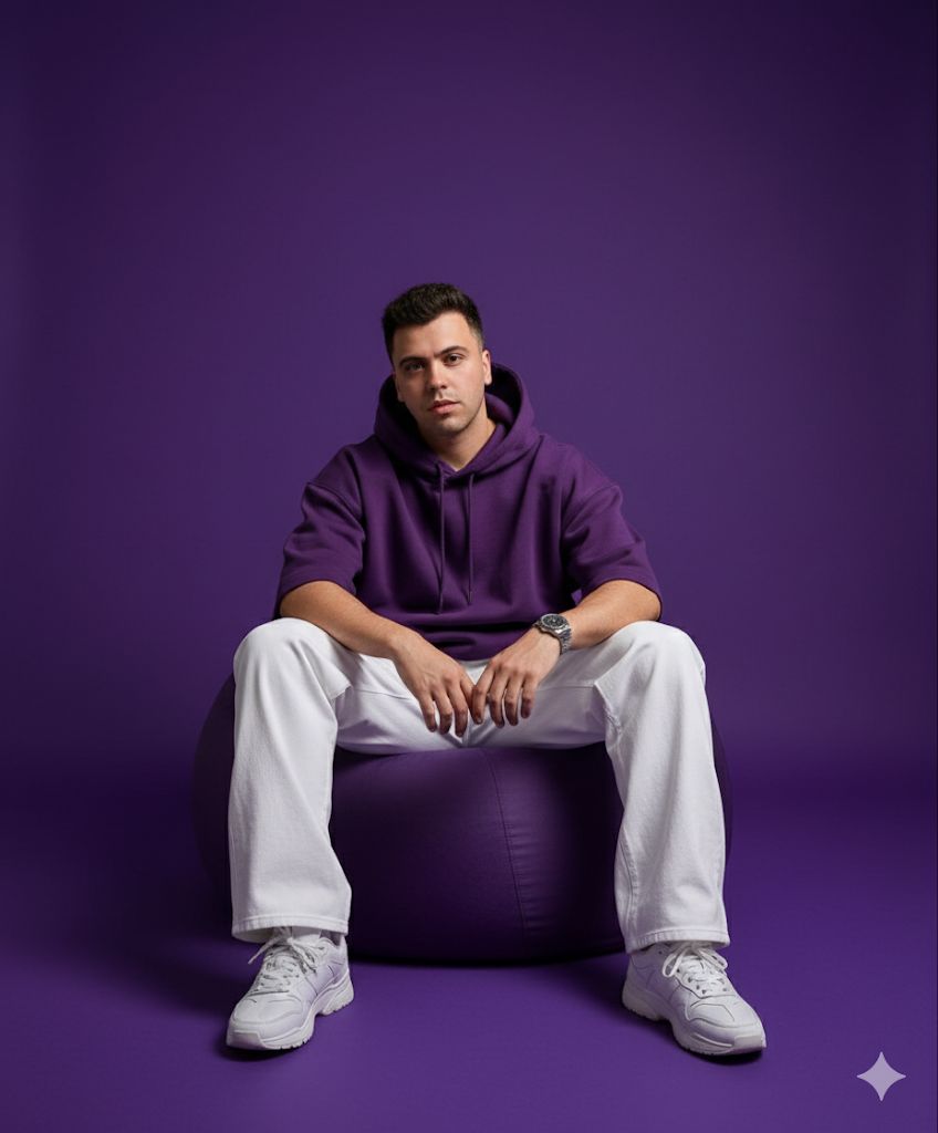 Seated on a deep purple bean bag, he wears purple oversized streetwear hoodie, wide white pants, chunky sneakers, silver watch. Solid purple background, Powerful drip vibes. Adidas campaign editorial look, dramatic studio lighting.
